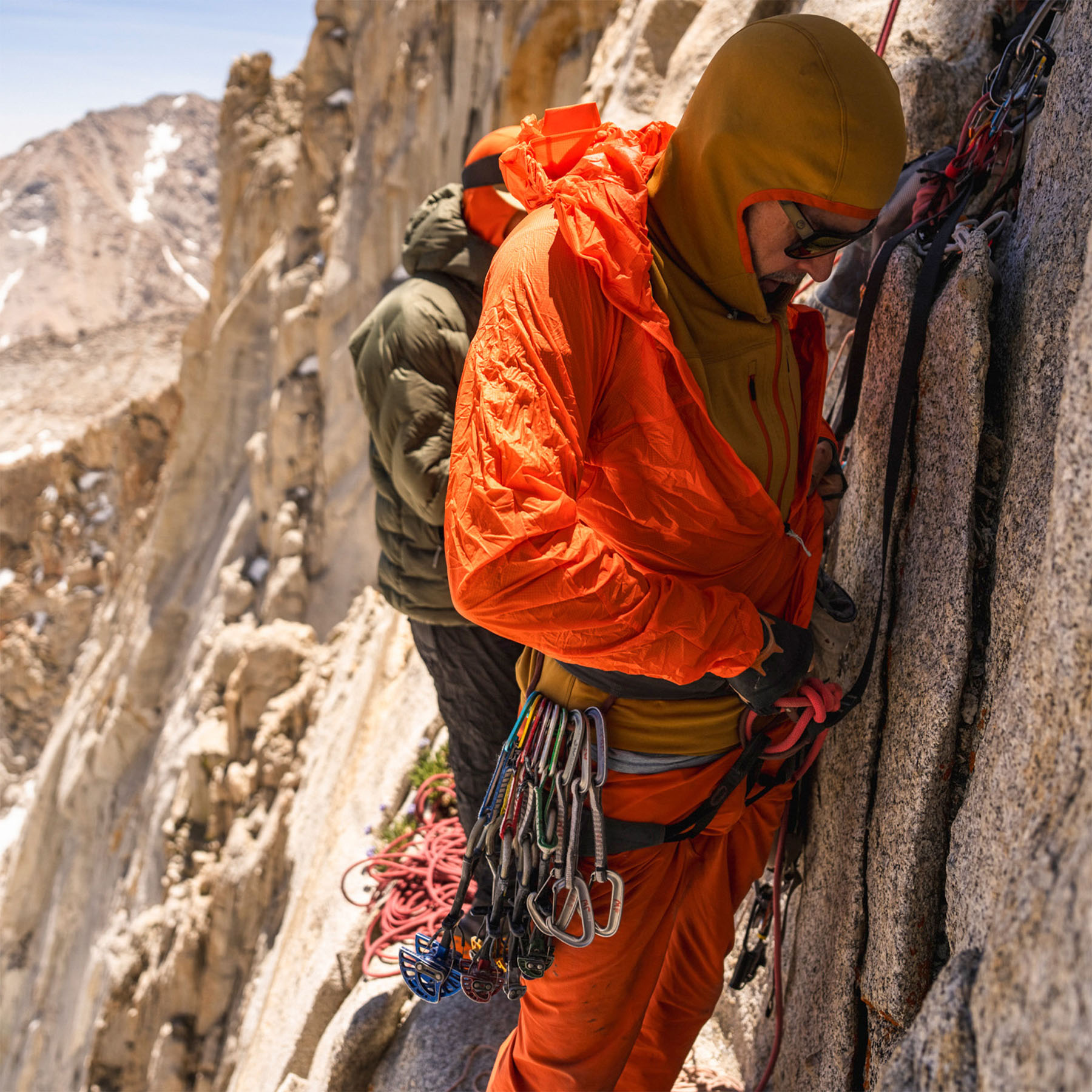 Качулка съвместима с каска и лесно сваляне – регулируема в две посоки, може да се сложи или свали с една ръка, дори когато якето е напълно закопчано. Тясната, катераческа кройка осигурява допълнително пространство в раменете за свобода на движение над главата, а дългият централен цип позволява лесно обличане и събличане или бързо проветряване при интензивно катерене.